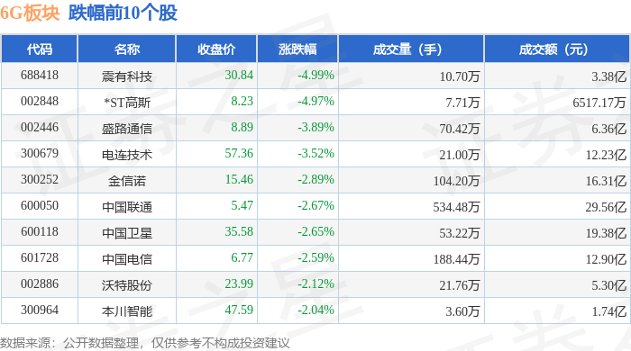 证券之星消息,9月18日6G板块较上一交易日下跌1.02%,震有科技领跌。当日上证指数报收于3831.66,下跌1.15%。深证成指报收于13075.66,下跌1.06%。6G板块个股涨跌见下表: