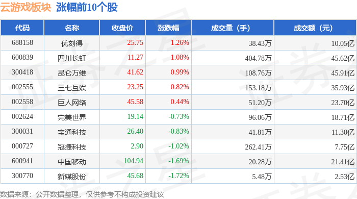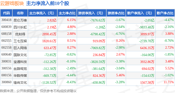 从资金流向上来看,当日云游戏板块主力资金净流出25.45亿元,游资资金净流入3.57亿元,散户资金净流入21.88亿元。云游戏板块个股资金流向见下表: