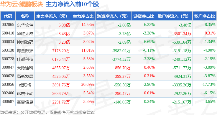 从资金流向上来看,当日华为云·鲲鹏板块主力资金净流出26.16亿元,游资资金净流出6.35亿元,散户资金净流入32.5亿元。华为云·鲲鹏板块个股资金流向见下表: