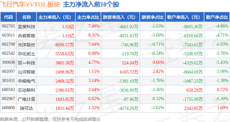 从资金流向上来看,当日飞行汽车/eVTOL板块主力资金净流出33.95亿元,游资资金净流入3.08亿元,散户资金净流入30.87亿元。飞行汽车/eVTOL板块个股资金流向见下表: