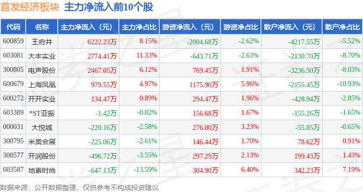 从资金流向上来看,当日首发经济板块主力资金净流出2.62亿元,游资资金净流入4207.59万元,散户资金净流入2.2亿元。首发经济板块个股资金流向见下表: