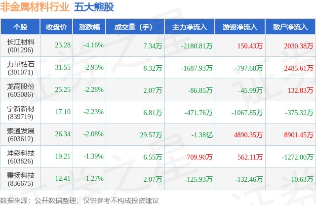 个股表现方面,非金属材料行业当日领跌股为长江材料(001296),该股当日报收23.28,下跌4.16%,成交量7.34万,主力资金净流出2180.81万元。力量钻石(301071)以下跌2.95%紧随其后,该股当日成交量8.32万,主力资金净流出1687.93万元。除此之外,龙高股份(605086)、宁新新材(839719)、索通发展(603612)均进入当日熊股之列。具体个股列表见下表: