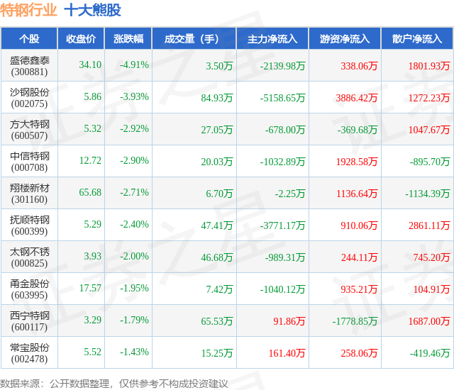 个股表现方面,特钢行业当日领跌股为盛德鑫泰(300881),该股当日报收34.1,下跌4.91%,成交量3.5万,主力资金净流出2139.98万元。沙钢股份(002075)以下跌3.93%紧随其后,该股当日成交量84.93万,主力资金净流出5158.65万元。除此之外,方大特钢(600507)、中信特钢(000708)、翔楼新材(301160)均进入当日熊股之列。具体个股列表见下表: