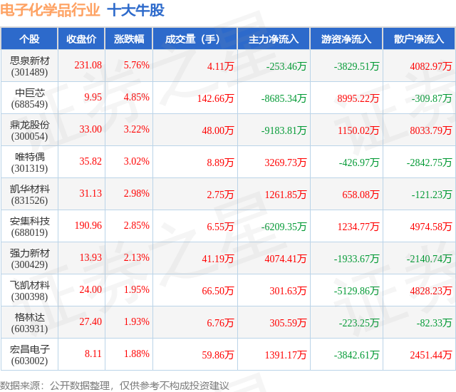 个股表现方面,电子化学品行业当日领涨股为思泉新材(301489),该股当日报收231.08,上涨5.76%,成交量4.11万,主力资金净流出253.46万元。中巨芯(688549)以上涨4.85%紧随其后,该股当日成交量142.66万,主力资金净流出8685.34万元。除此之外,鼎龙股份(300054)、唯特偶(301319)、凯华材料(831526)均进入当日牛股之列。具体个股列表见下表: