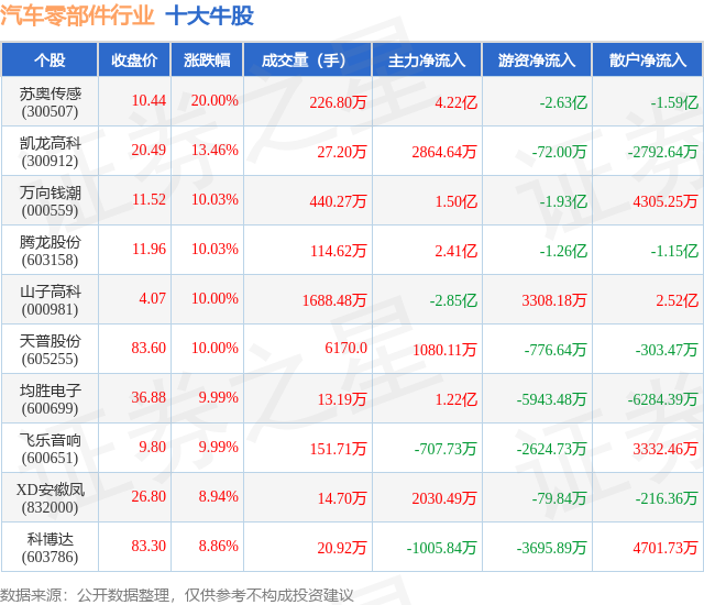 个股表现方面,汽车零部件行业当日领涨股为苏奥传感(300507),该股当日报收10.44,上涨20.0%,成交量226.8万,主力资金净流入4.22亿元。凯龙高科(300912)以上涨13.46%紧随其后,该股当日成交量27.2万,主力资金净流入2864.64万元。除此之外,万向钱潮(000559)、腾龙股份(603158)、山子高科(000981)均进入当日牛股之列。具体个股列表见下表: