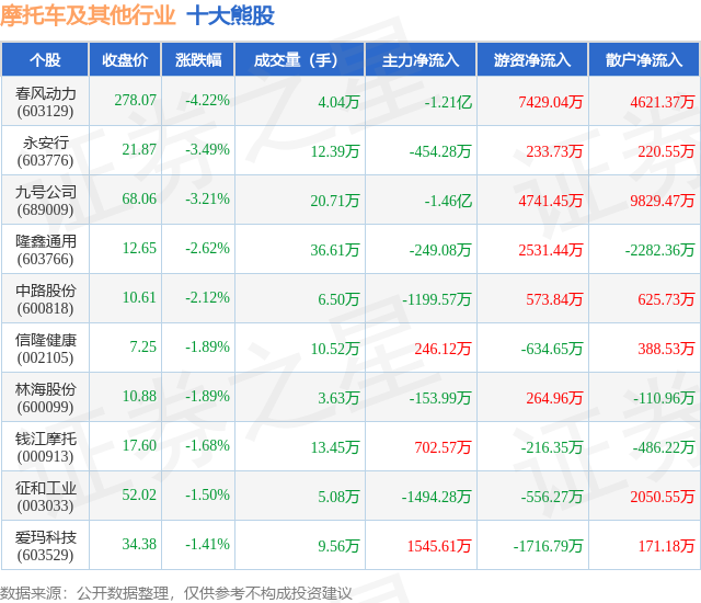 个股表现方面,摩托车及其他行业当日领跌股为春风动力(603129),该股当日报收278.07,下跌4.22%,成交量4.04万,主力资金净流出1.21亿元。永安行(603776)以下跌3.49%紧随其后,该股当日成交量12.39万,主力资金净流出454.28万元。除此之外,九号公司(689009)、隆鑫通用(603766)、中路股份(600818)均进入当日熊股之列。具体个股列表见下表: