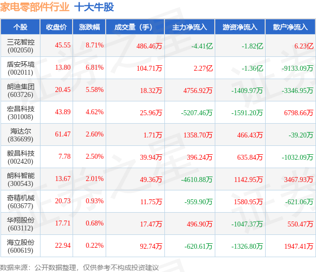 个股表现方面,家电零部件行业当日领涨股为三花智控(002050),该股当日报收45.55,上涨8.71%,成交量486.46万,主力资金净流出4.41亿元。盾安环境(002011)以上涨6.81%紧随其后,该股当日成交量104.71万,主力资金净流入2.27亿元。除此之外,朗迪集团(603726)、宏昌科技(301008)、海达尔(836699)均进入当日牛股之列。具体个股列表见下表: