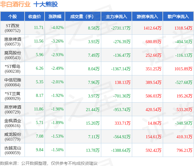 个股表现方面,非白酒行业当日领跌股为ST西发(000752),该股当日报收11.71,下跌4.02%,成交量8.58万,主力资金净流出2731.17万元。惠泉啤酒(600573)以下跌3.26%紧随其后,该股当日成交量3.93万,主力资金净流出276.39万元。除此之外,莫高股份(600543)、*ST椰岛(600238)、中信尼雅(600084)均进入当日熊股之列。具体个股列表见下表:
