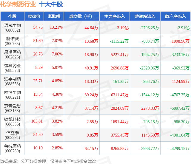 个股表现方面,化学制药行业当日领涨股为迈威生物(688062),该股当日报收54.75,上涨13.21%,成交量44.64万,主力资金净流入3.19亿元。新诺威(300765)以上涨7.07%紧随其后,该股当日成交量13.68万,主力资金净流出1115.22万元。除此之外,易明医药(002826)、盟科药业(688373)、汇宇制药(688553)均进入当日牛股之列。具体个股列表见下表: