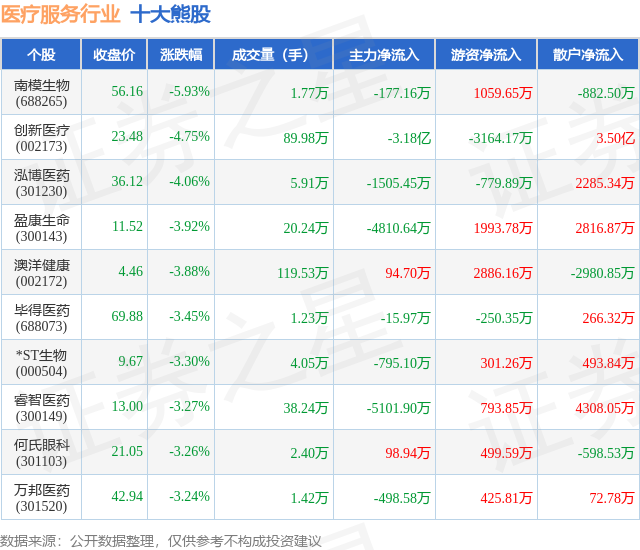 个股表现方面,医疗服务行业当日领跌股为南模生物(688265),该股当日报收56.16,下跌5.93%,成交量1.77万,主力资金净流出177.16万元。创新医疗(002173)以下跌4.75%紧随其后,该股当日成交量89.98万,主力资金净流出3.18亿元。除此之外,泓博医药(301230)、盈康生命(300143)、澳洋健康(002172)均进入当日熊股之列。具体个股列表见下表: