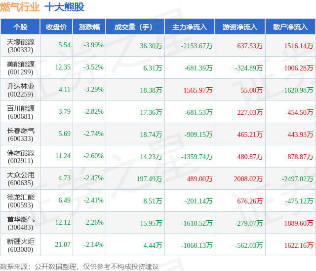 个股表现方面,燃气行业当日领跌股为天壕能源(300332),该股当日报收5.54,下跌3.99%,成交量36.3万,主力资金净流出2153.67万元。美能能源(001299)以下跌3.52%紧随其后,该股当日成交量6.31万,主力资金净流出681.39万元。除此之外,升达林业(002259)、百川能源(600681)、长春燃气(600333)均进入当日熊股之列。具体个股列表见下表: