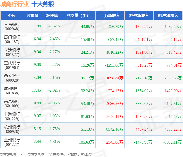 个股表现方面,城商行行业当日领跌股为青岛银行(002948),该股当日报收4.84,下跌2.62%,成交量43.05万,主力资金净流出426.79万元。厦门银行(601187)以下跌2.46%紧随其后,该股当日成交量15.4万,主力资金净流出697.45万元。除此之外,长沙银行(601577)、重庆银行(601963)、西安银行(600928)均进入当日熊股之列。具体个股列表见下表: