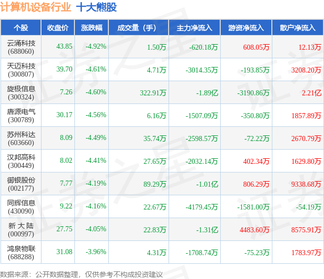 个股表现方面,计算机设备行业当日领跌股为云涌科技(688060),该股当日报收43.85,下跌4.92%,成交量1.5万,主力资金净流出620.18万元。天迈科技(300807)以下跌4.61%紧随其后,该股当日成交量4.71万,主力资金净流出3014.35万元。除此之外,旋极信息(300324)、唐源电气(300789)、苏州科达(603660)均进入当日熊股之列。具体个股列表见下表: