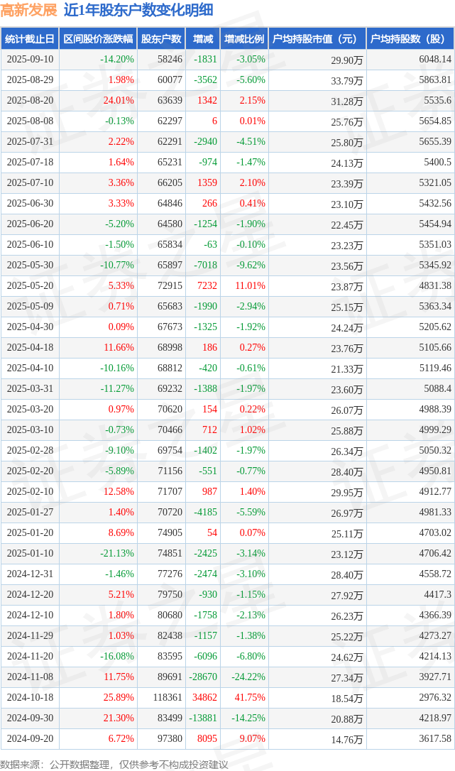 从股价来看,2025年8月29日至2025年9月10日,高新发展区间跌幅为14.2%,在此期间股东户数减少1831.0户,减幅为3.05%。