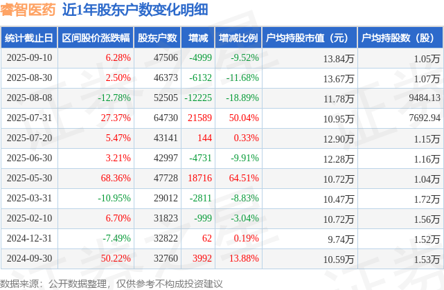 从股价来看,2025年8月8日至2025年9月10日,睿智医药区间涨幅为6.28%,在此期间股东户数减少4999.0户,减幅为9.52%。