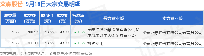 证券之星消息,9月18日艾森股份发生大宗交易,交易数据如下: