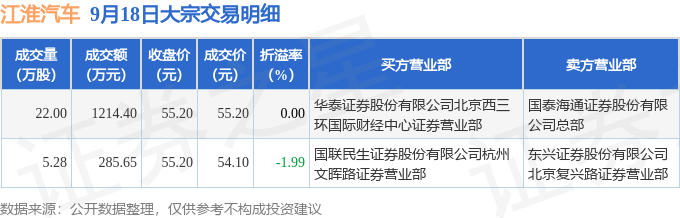 证券之星消息,9月18日江淮汽车发生大宗交易,交易数据如下: