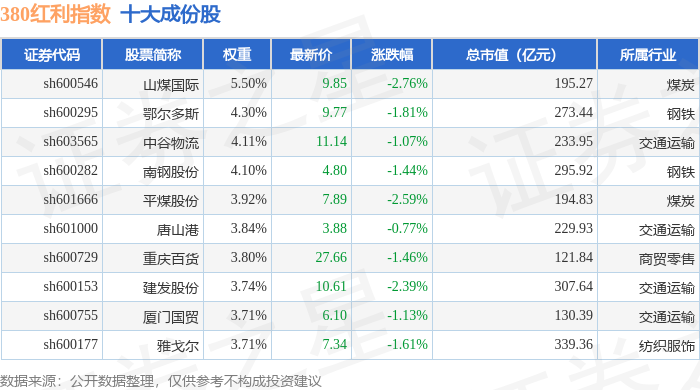 证券之星消息,9月18日,380红利(000150)指数报收于11481.0点,跌1.86%,成交70.18亿元,换手率1.12%。当日该指数成份股中,上涨的有1家,中文传媒以1.66%的涨幅领涨,下跌的有29家,淮北矿业以3.96%的跌幅领跌。