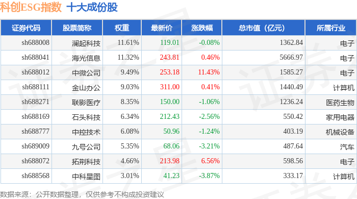 证券之星消息,9月18日,科创ESG(000691)指数报收于1444.17点,涨0.84%,成交807.87亿元,换手率2.17%。当日该指数成份股中,上涨的有14家,中微公司以11.43%的涨幅领涨,下跌的有36家,中科星图以3.87%的跌幅领跌。