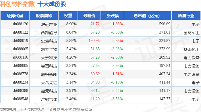 科创材料(000689)指数十大成份股详情如下: