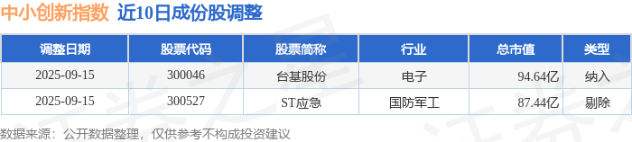 近10日内中小创新(399015)指数成份股做了调整,新纳入了1只股票,剔除了1只股票。