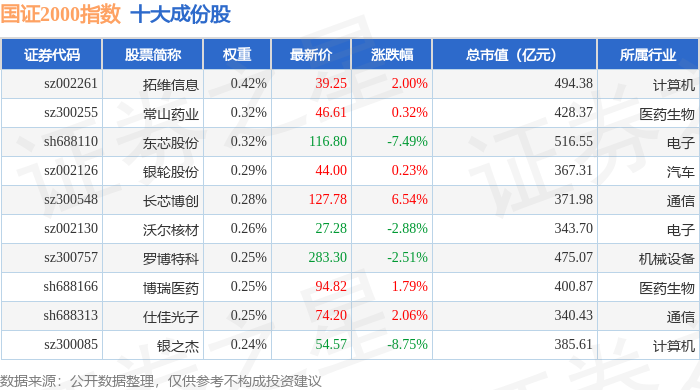 证券之星消息,9月18日,国证2000(399303)指数报收于9794.33点,跌1.06%,成交9726.28亿元,换手率4.78%。当日该指数成份股中,上涨的有408家,德科立以20.0%的涨幅领涨,下跌的有1570家,银之杰以8.75%的跌幅领跌。