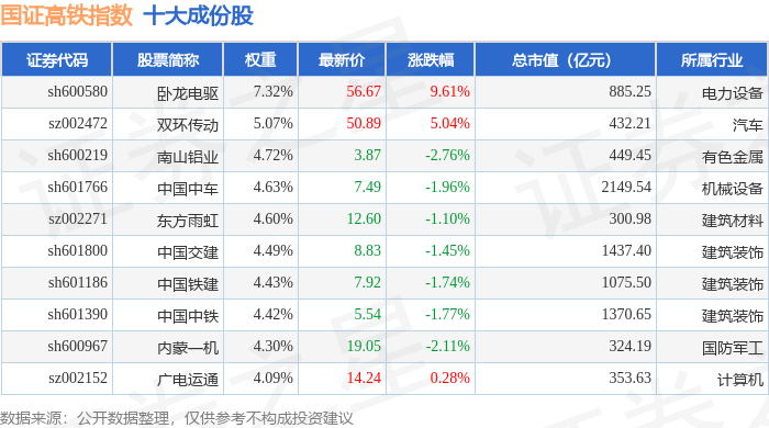 证券之星消息,9月18日,国证高铁(399419)指数报收于2229.75点,跌0.06%,成交431.13亿元,换手率1.44%。当日该指数成份股中,上涨的有8家,卧龙电驱以9.61%的涨幅领涨,下跌的有42家,佳讯飞鸿以6.98%的跌幅领跌。