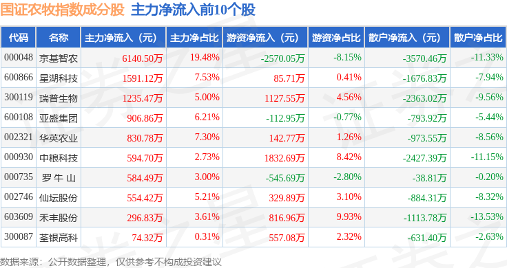 资金流向方面,国证农牧(399435)指数成份股当日主力资金净流出合计10.27亿元,游资资金净流入合计2.94亿元,散户资金净流入合计7.33亿元。成份股资金流向详情见下表: