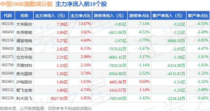资金流向方面,中创100R(399611)指数成份股当日主力资金净流出合计187.89亿元,游资资金净流入合计50.75亿元,散户资金净流入合计137.14亿元。成份股资金流向详情见下表: