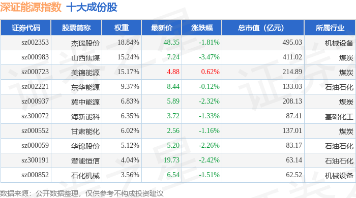 证券之星消息,9月18日,深证能源(399613)指数报收于3109.76点,跌1.59%,成交35.17亿元,换手率2.15%。当日该指数成份股中,上涨的有1家,美锦能源以0.62%的涨幅领涨,下跌的有12家,山西焦煤以3.47%的跌幅领跌。