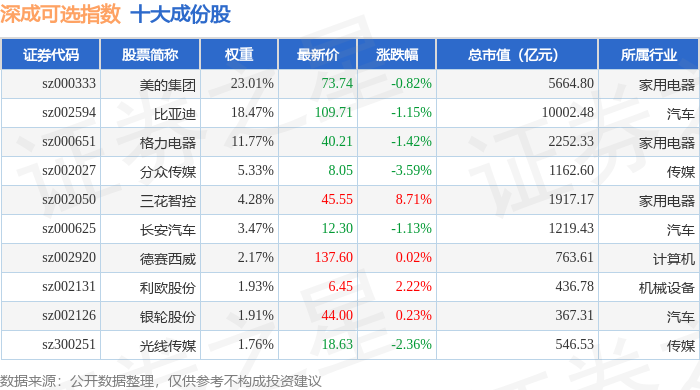 证券之星消息,9月18日,深成可选(399683)指数报收于1966.72点,跌0.5%,成交988.19亿元,换手率4.84%。当日该指数成份股中,上涨的有9家,万向钱潮以10.03%的涨幅领涨,下跌的有34家,中鼎股份以4.28%的跌幅领跌。