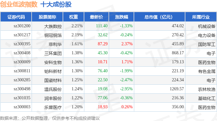 证券之星消息,9月18日,创业低波(399692)指数报收于4005.82点,跌1.37%,成交872.98亿元,换手率3.59%。当日该指数成份股中,上涨的有16家,通裕重工以12.75%的涨幅领涨,下跌的有83家,亿联网络以4.79%的跌幅领跌。