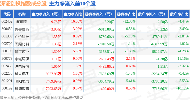 资金流向方面,深证创投(399696)指数成份股当日主力资金净流出合计53.71亿元,游资资金净流出合计8068.32万元,散户资金净流入合计54.51亿元。成份股资金流向详情见下表: