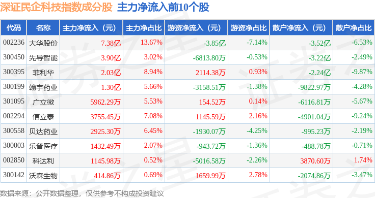 资金流向方面,深证民企科技(970059)指数成份股当日主力资金净流出合计100.92亿元,游资资金净流入合计32.19亿元,散户资金净流入合计68.73亿元。成份股资金流向详情见下表: