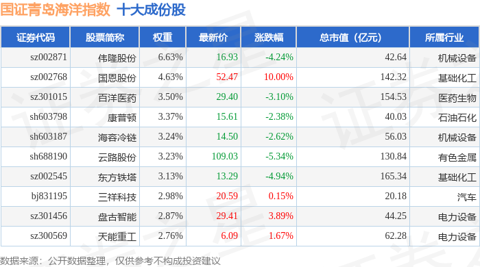 国证青岛海洋(980532)指数十大成份股详情如下: