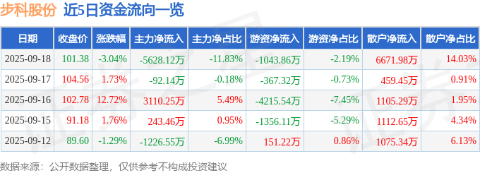 证券之星消息,截至2025年9月18日收盘,步科股份(688160)报收于101.38元,下跌3.04%,换手率5.44%,成交量4.57万手,成交额4.76亿元。