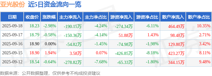 证券之星消息,截至2025年9月18日收盘,亚光股份(603282)报收于18.23元,下跌2.98%,换手率3.79%,成交量2.43万手,成交额4486.47万元。