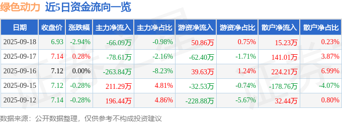 证券之星消息,截至2025年9月18日收盘,绿色动力(601330)报收于6.93元,下跌2.94%,换手率0.97%,成交量9.63万手,成交额6757.82万元。