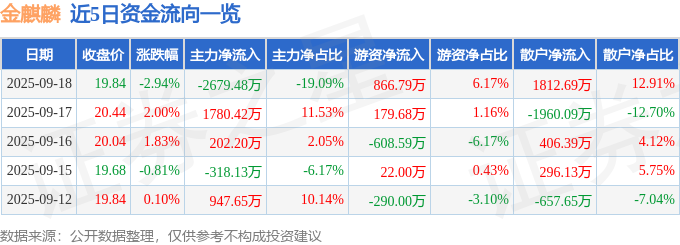 证券之星消息,截至2025年9月18日收盘,金麒麟(603586)报收于19.84元,下跌2.94%,换手率3.55%,成交量6.97万手,成交额1.4亿元。