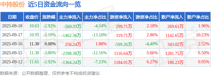 证券之星消息,截至2025年9月18日收盘,中持股份(603903)报收于10.63元,下跌2.92%,换手率5.07%,成交量12.94万手,成交额1.37亿元。