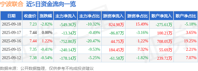 证券之星消息,截至2025年9月18日收盘,宁波联合(600051)报收于7.23元,下跌2.82%,换手率2.34%,成交量7.28万手,成交额5324.56万元。