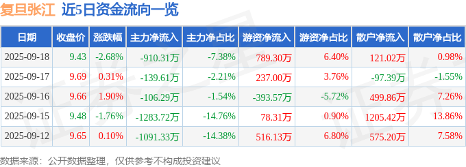证券之星消息,截至2025年9月18日收盘,复旦张江(688505)报收于9.43元,下跌2.68%,换手率1.8%,成交量12.78万手,成交额1.23亿元。