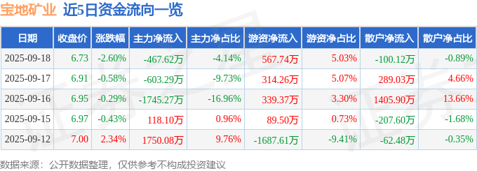证券之星消息,截至2025年9月18日收盘,宝地矿业(601121)报收于6.73元,下跌2.6%,换手率4.37%,成交量16.62万手,成交额1.13亿元。