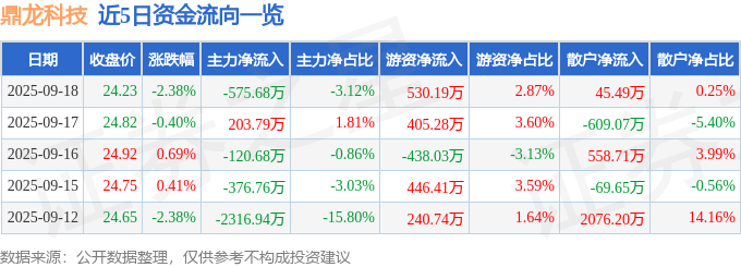 证券之星消息,截至2025年9月18日收盘,鼎龙科技(603004)报收于24.23元,下跌2.38%,换手率12.68%,成交量7.47万手,成交额1.84亿元。