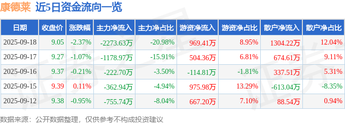 9月18日的资金流向数据方面,主力资金净流出2273.63万元,占总成交额20.98%,游资资金净流入969.41万元,占总成交额8.95%,散户资金净流入1304.22万元,占总成交额12.04%。