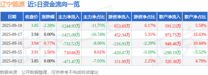 证券之星消息,截至2025年9月18日收盘,辽宁能源(600758)报收于3.85元,下跌2.28%,换手率2.07%,成交量27.3万手,成交额1.06亿元。