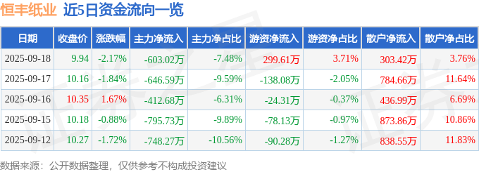 证券之星消息,截至2025年9月18日收盘,恒丰纸业(600356)报收于9.94元,下跌2.17%,换手率2.68%,成交量8.0万手,成交额8065.82万元。