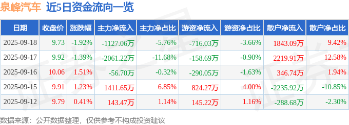 9月18日的资金流向数据方面,主力资金净流出1127.06万元,占总成交额5.76%,游资资金净流出716.03万元,占总成交额3.66%,散户资金净流入1843.09万元,占总成交额9.42%。