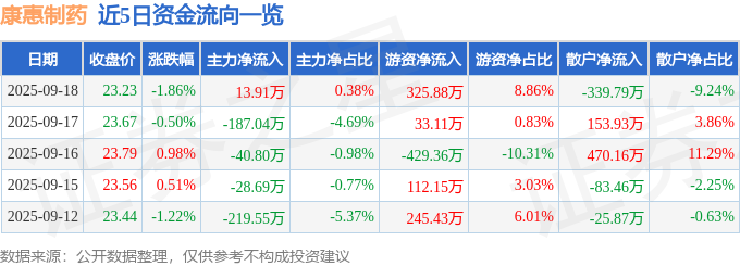 证券之星消息,截至2025年9月18日收盘,康惠制药(603139)报收于23.23元,下跌1.86%,换手率1.57%,成交量1.57万手,成交额3676.63万元。