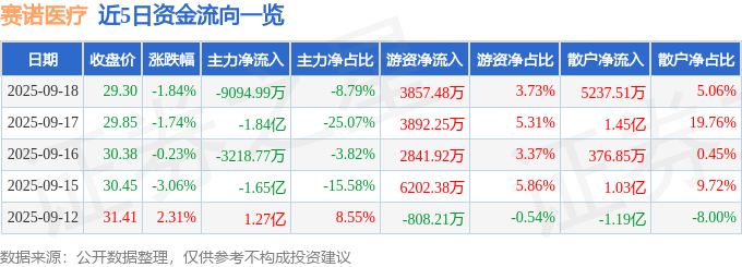 证券之星消息,截至2025年9月18日收盘,赛诺医疗(688108)报收于29.3元,下跌1.84%,换手率8.3%,成交量34.55万手,成交额10.34亿元。